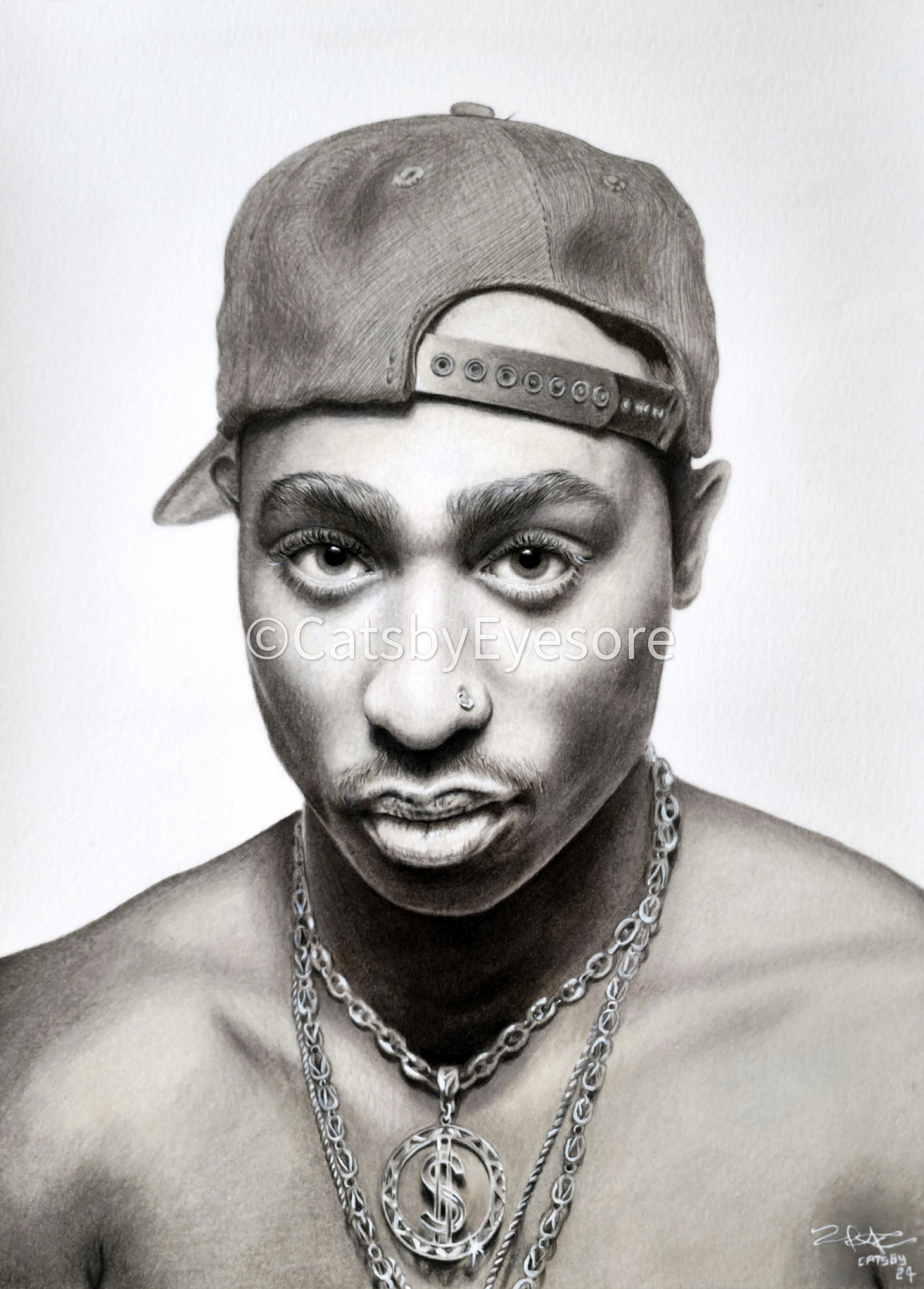 This is a print reproduction of my colour pencil portrait of 90's rapper Tupac Shakur. The original black and white reference is dark, pixellated and blurred so I studied music videos and multiple photographic images of Tupac in order to remaster his image. This allowed me to add intricate detail and clearer form around the shape of the jawline and also intricate detailing especially around the eyes, eyelashes and brows, cheekbones, jewellery and hat. Although it appears as a black and white portrait i have used very subtle tones of actual colour to add depth and make it more dynamic. This adds a quality and sense of life to the drawing that really compliments the soulful gaze of the legendary rap musician, all drawn completely freehand.