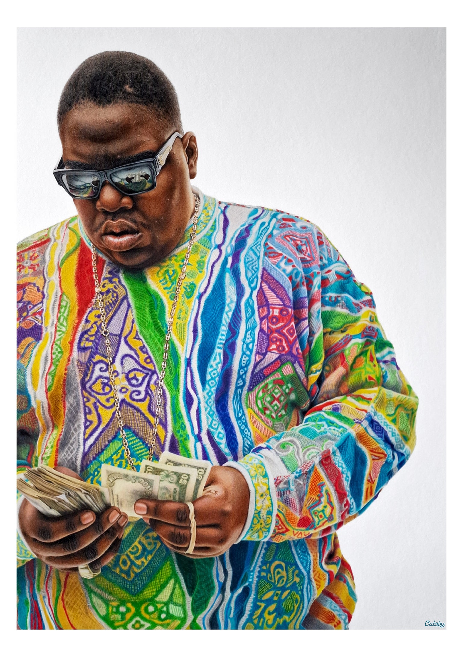 This is a print reproduction of my original coloured pencil drawing of 90's rap legend The Notorious BIG. From the iconic image of Biggie in a Coogi sweater the artwork displays a completely remastered vision of the original pixelated and blurred reference photograph.