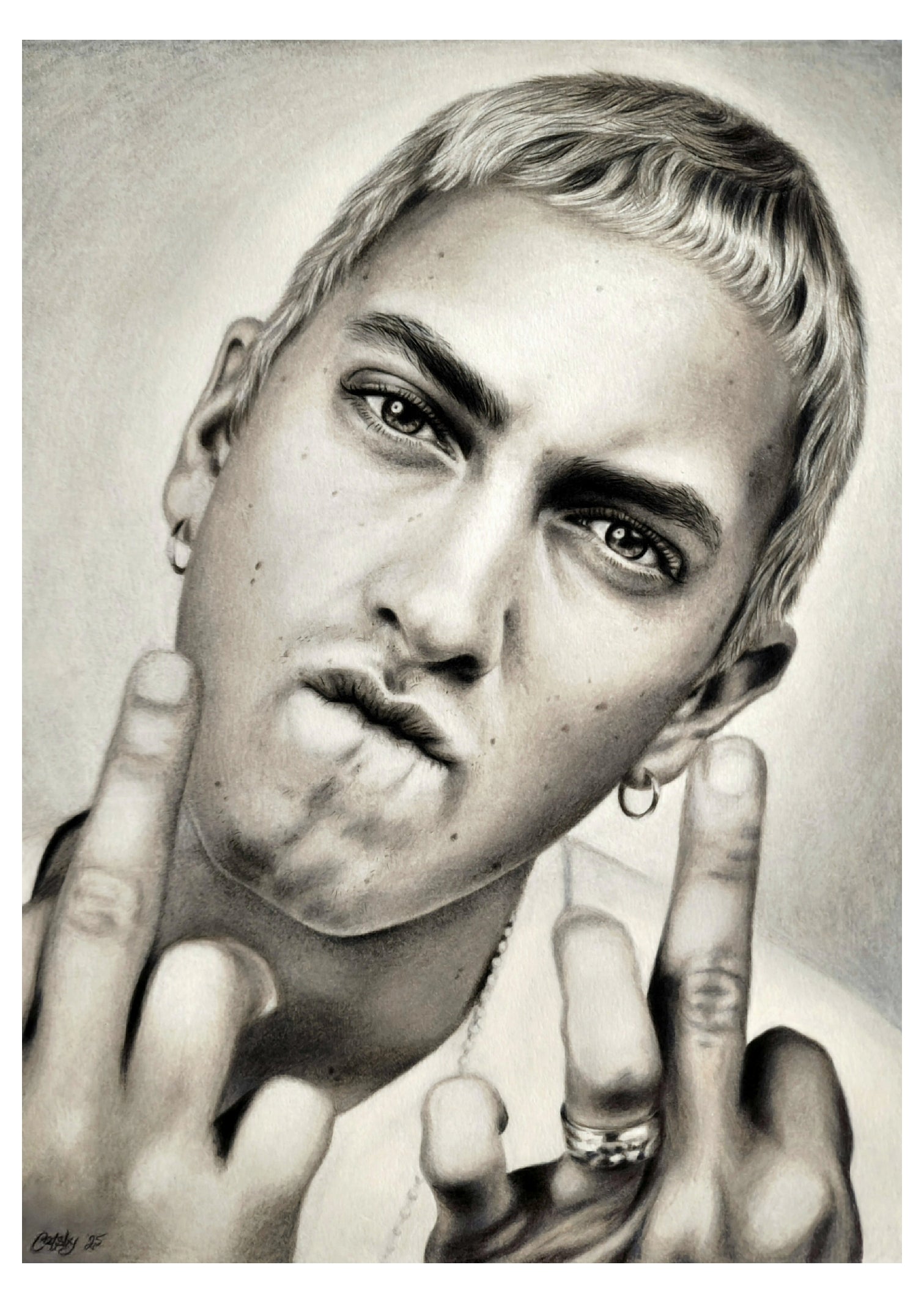 This is a print reproduction of my original coloured pencil portrait of one of rap musics greatest; Eminem, also known as Slim-Shady (real name Marshall Mathers). In keeping with my my series of deceased 90s rappers I have depicted Eminems alter ego Slim Shady who he killed off in his latest album "The Death of Slim Shady (Coup de Grâce)". Also working from poor quality reference this time I watched Eminems older music videos and movie to add not only detail but fine tune the facial expression to glean a slight element of sadness in his eyes and of course that offensive real Slim Shady vibe. Although the portrait appears as black and white I've actually used elements of colour within the undertones of the portrait in order to create a dynamic and lifelike effect whilst adding depth.
